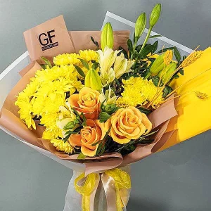 Луч солнца- букет с лилиями и хризантемами