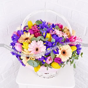 Весенний сюрприз - корзина с желтыми и розовыми герберами