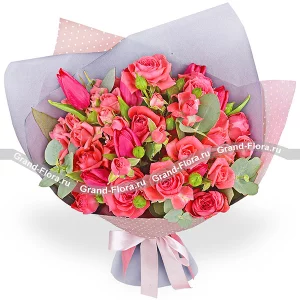 Счастливая весна - букет с розовыми розами и тюльпанами