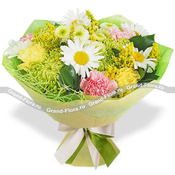 ДЕЛЮКС: ромашка белая - 15 шт, хризантема одноголовая зеленая - 14 шт, хризантема кустовая белая (сантини) - 3 шт, гвоздика розовая одноголовая - 10 шт, солидаго - 7 шт,рускус, фетр зеленый, сетка зеленая.