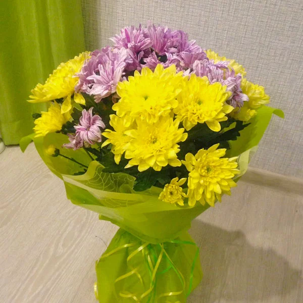 Стандартный: хризантема кустовая ромашковая желтая - 7 шт., хризантема кустовая ромашковая фиолетовая - 8 шт., упаковка, лента. Примерный размер: 30Х30 см.