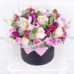 Букет выполнен из чудесных белых роз сорта Ломоносов, очаровательных фиолетовых и розовых тюльпанов, а так же изящной розовой эустомы и невообразимо прекрасной орхидеи кристально – белого оттенка. Композиция украшена эвкалиптом и заключена в шляпную коробку. Высота композиции от 30 см, диаметр от 25см до 35 см, в зависимости от выбранного Вами варианта. Обращаем Ваш внимание, что состав и оформление могут отличаться.