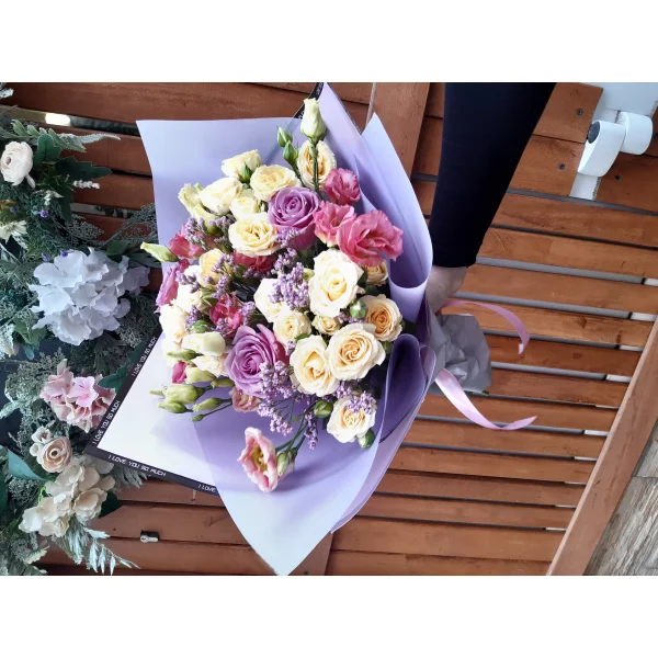 Чарующие и необыкновенные розы сиреневого и кремового  оттенка, розовая эустома и фиолетовый лимониум в букете выглядят гармонично, роскошно и привлекательно.