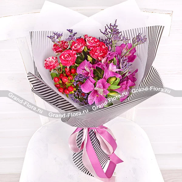 Роза кустовая красная– 3 шт., альстромерия фиолетовая– 3 шт., гиперикум красный– 3 шт., лимониум фиолетовый– 2 шт., упаковка, лента.